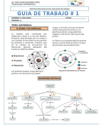 El documento habla sobre conceptos básicos de electrónica como el átomo y sus partículas, magnitudes eléctricas como tensión, resistencia e intensidad. Explica la fórmula para calcular cada una de estas magnitudes y provee ejemplos numéricos. También define potencia eléctrica y su fórmula. Al final incluye un taller con preguntas sobre estos conceptos.