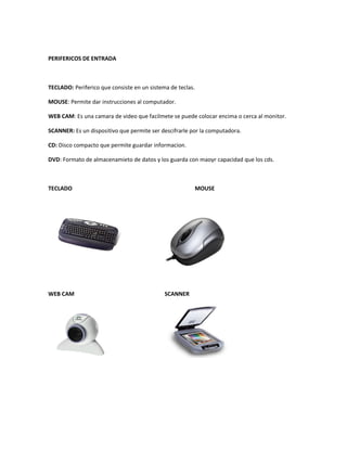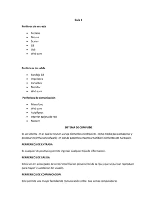 Este documento describe los principales periféricos de entrada, salida y comunicación de un sistema de computo. Los periféricos de entrada incluyen teclados, mouse, escáneres, CDs, USB y cámaras web que permiten ingresar información al sistema. Los periféricos de salida, como monitores, bocinas, impresoras y cámaras web, muestran u outputean la información procesada. Los periféricos de comunicación, entre ellos tarjetas de red, modems, micrófonos y cámaras web, facilitan