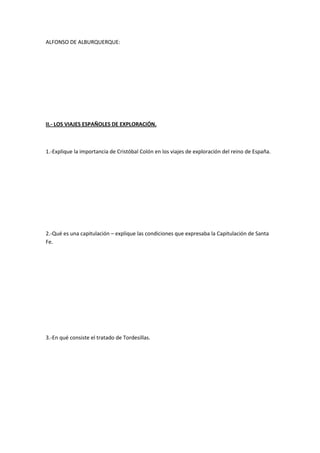 El documento resume los viajes de exploración portugueses y españoles en el siglo XV. Detalla las contribuciones de figuras clave como Enrique el Navegante de Portugal, Bartolomé Díaz, Vasco de Gama y Alfonso de Alburquerque, así como Cristóbal Colón, el tratado de Tordesillas y las expediciones de Magallanes y Elcano para España. El objetivo es reconocer estos viajes y personajes históricos y su importancia para la expansión europea.