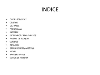 Este documento proporciona una introducción a Scratch, incluyendo una definición de Scratch como un entorno de programación para crear historias interactivas de manera fácil. Explica los conceptos básicos como objetos, disfraces, programas, la interfaz, escenarios, paletas de bloques, sonidos y rotación.