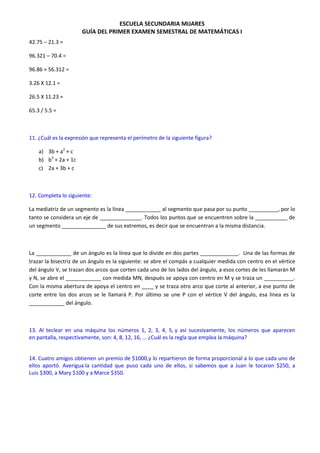 Este documento presenta una guía de examen de matemáticas de primer semestre que incluye 14 problemas sobre una variedad de temas matemáticos como fracciones, álgebra, geometría y estadística. Los estudiantes deben mostrar sus trabajos y procedimientos al resolver los problemas y enviar su guía por correo electrónico o entregarla en el primer día de clases.