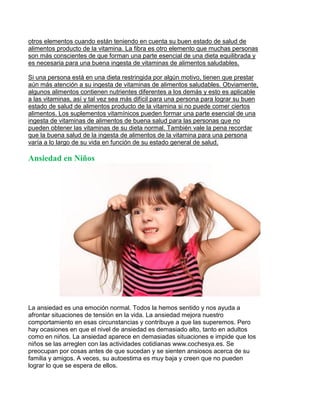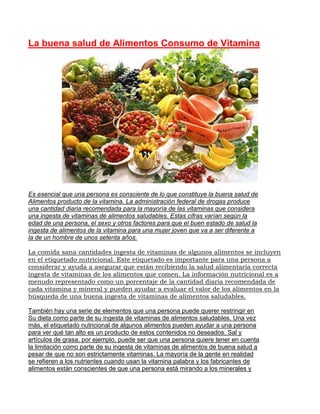 El documento habla sobre la importancia de una dieta saludable y equilibrada para obtener las vitaminas y nutrientes necesarios para el bienestar. Explica que las recomendaciones diarias de vitaminas varían según factores como la edad y el sexo. También menciona que la etiqueta nutricional de los alimentos proporciona información sobre el contenido vitamínico. Además, señala que algunas personas necesitan prestar más atención a su ingesta de vitaminas si siguen dietas restrictivas o no pueden comer ciertos alimentos.