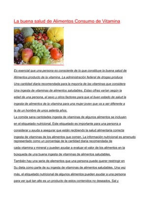 El documento habla sobre la importancia de una dieta saludable y equilibrada para obtener las vitaminas y nutrientes necesarios. Explica que las recomendaciones diarias de vitaminas varían según factores como la edad y el sexo. También menciona la importancia de leer las etiquetas nutricionales de los alimentos para evaluar su contenido vitamínico y mineral y poder controlar otros elementos como la sal o la grasa. Finalmente, señala que para personas con dietas restringidas, los suplementos pueden ser una parte importante de su ingesta de vitaminas.