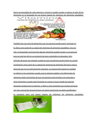 Este documento discute la importancia de una dieta saludable y la ingesta adecuada de vitaminas y nutrientes. Explica que las recomendaciones diarias varían según factores como la edad y el sexo. También destaca la importancia de leer las etiquetas nutricionales para evaluar el valor de los alimentos y asegurar una ingesta balanceada. Finalmente, señala que algunas personas pueden necesitar suplementos vitamínicos para obtener los nutrientes necesarios.