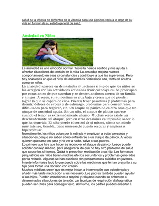 El documento habla sobre la importancia de una buena ingesta de vitaminas a través de los alimentos. Explica que las recomendaciones diarias de vitaminas varían según factores como la edad y el sexo. También menciona que el etiquetado nutricional de los alimentos proporciona información sobre el contenido vitamínico. Además, señala que algunas personas deben prestar más atención a su ingesta de vitaminas si siguen dietas restrictivas o no pueden obtener vitaminas de su dieta habitual.