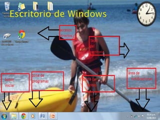 El documento proporciona información sobre el sistema operativo Windows. Explica que Windows es un conjunto de programas que posibilita la administración de los recursos de una computadora. Define varios tipos de archivos, carpetas y formas de mover y copiar elementos en el sistema. También describe algunas de las herramientas y funciones principales de Windows como el Explorador de Archivos y el Panel de Control.