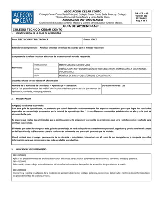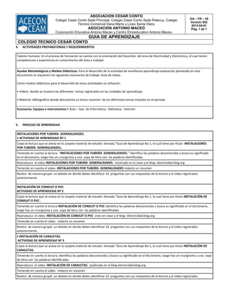 Este documento presenta una guía de aprendizaje para estudiantes del grado 11 en el área de electricidad y electrónica. La guía propone cuatro actividades de aprendizaje que cubren temas relacionados con instalaciones eléctricas por tubería, conduit o PVC, canaletas y cajas. Cada actividad incluye lecturas, videos, ejercicios léxicos y debates grupales con el fin de que los estudiantes analicen circuitos eléctricos y aprendan sobre los procedimientos de instalación eléctrica. La