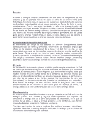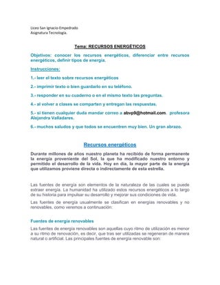 El documento presenta información sobre recursos energéticos y tipos de energía. Explica que la mayoría de la energía que usamos proviene del sol de forma directa o indirecta. Define las fuentes de energía renovables como aquellas que se regeneran naturalmente, como ríos, océanos, viento, biomasa y sol. También define las fuentes no renovables como combustibles fósiles y energía nuclear, cuyos recursos son limitados. Finalmente, pide responder preguntas sobre estos temas.