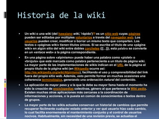 Un wiki es un sitio web cuyas páginas pueden ser editadas por múltiples usuarios. Los wikis permiten la colaboración en la creación y edición de contenido. Algunas características clave de los wikis incluyen que cualquiera puede editar el contenido, usan marcadores de hipervínculo simplificados, y conservan un historial de cambios. Los wikis se usan comúnmente para enciclopedias colaborativas y proyectos de grupo.