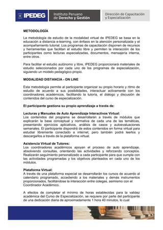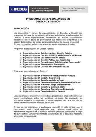 Este documento describe varios programas de especialización en derecho y gestión que se ofrecen de manera virtual. Los programas buscan proporcionar conocimientos especializados a estudiantes y profesionales interesados a través de una metodología de aprendizaje flexible que incluye lecturas, tutoría virtual y evaluaciones. Los estudiantes pueden elegir entre programas de gestión pública o derecho y completarán entre 120 a 240 horas de estudio para obtener un certificado al aprobar las evaluaciones.