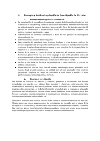 Este documento describe los conceptos y procesos fundamentales de la investigación de mercados. Explica que la investigación de mercados implica el proceso sistemático de recopilación de información para desarrollar y controlar las acciones comerciales y tomar decisiones empresariales. Luego detalla las principales etapas de este proceso, incluida la determinación de objetivos, fuentes, métodos de recopilación de datos como encuestas y paneles, y el análisis e interpretación de la información recopilada.