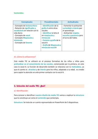 Este documento presenta una guía didáctica para enseñar la letra A a estudiantes de 4 años utilizando un cuento en PowerPoint. El cuento consta de 5 diapositivas e incluye actividades antes, durante y después para motivar a los estudiantes, profundizar en el aprendizaje de la letra A y reforzar los conceptos. El objetivo es que los estudiantes identifiquen la letra A y desarrollen su conciencia fonológica de una manera atractiva e interactiva.