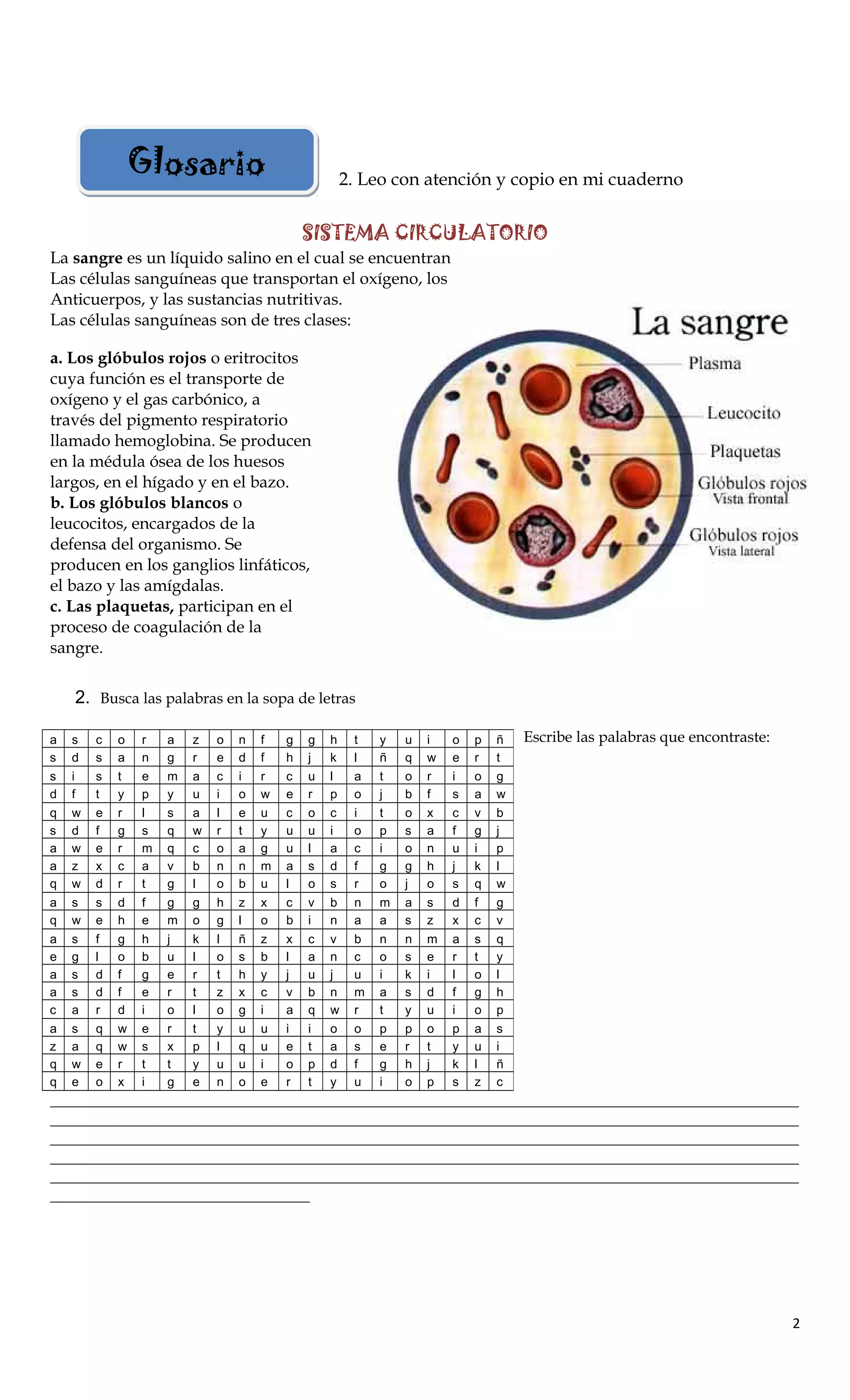 Este documento proporciona información sobre el sistema circulatorio humano. Explica que la sangre circula a través del cuerpo transportando oxígeno, nutrientes, anticuerpos y desechos. Describe las tres células de la sangre y sus funciones. Además, detalla las estructuras principales del sistema circulatorio como el corazón, las arterias, las venas y los capilares. Finalmente, resume los dos circuitos de circulación de la sangre: la circulación pulmonar y la circulación sistémica.