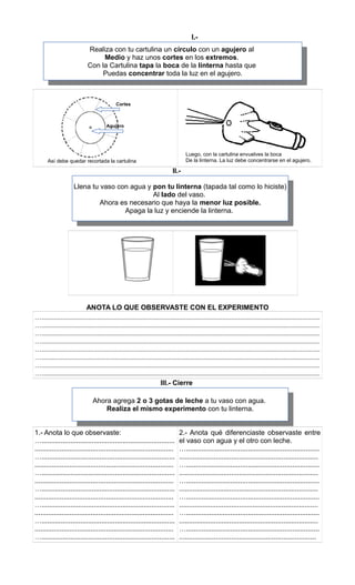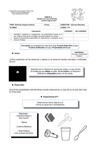 La guía educativa de la Fundación Educacional Cristo Rey aborda cómo viaja la luz, enfocándose en sus propiedades físicas y la diferencia entre fuentes naturales y artificiales. Se propone un experimento práctico para que los alumnos identifiquen cómo la luz viaja en línea recta y cómo se comporta al interactuar con diferentes medios. Los estudiantes deben aplicar lo aprendido en los experimentos y documentar sus observaciones.