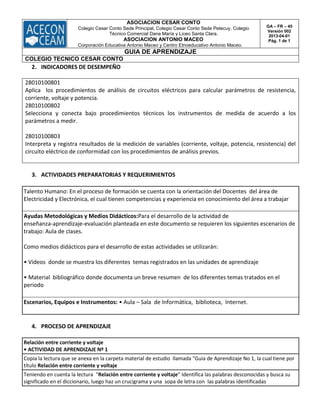 Este documento presenta una guía de aprendizaje para estudiantes de séptimo grado sobre análisis de circuitos eléctricos. La guía incluye cuatro actividades de aprendizaje que cubren las relaciones entre corriente y voltaje, corriente y resistencia, voltaje y resistencia, y potencia eléctrica. Los estudiantes completarán lecturas, crucigramas, debates y resúmenes sobre estos temas como parte del proceso de aprendizaje. El docente evaluará el progreso de los estudiantes utilizando list