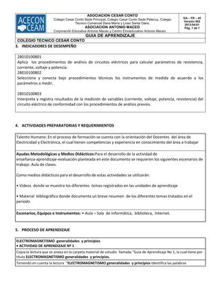 Este documento presenta una guía de aprendizaje para estudiantes de noveno grado sobre el análisis de circuitos eléctricos. La guía incluye tres actividades de aprendizaje sobre electromagnetismo, sus aplicaciones en la vida diaria y una práctica experimental. Cada actividad implica leer materiales, ver videos, identificar palabras desconocidas, realizar debates y resúmenes para evaluar el aprendizaje de los estudiantes.