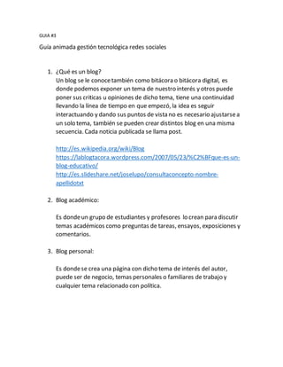 Un blog es una bitácora digital donde las personas pueden publicar contenido sobre temas de su interés para que otros puedan comentar u opinar, manteniendo una línea de tiempo continua. Existen blogs académicos creados por estudiantes y profesores para discutir temas escolares, y blogs personales donde individuos comparten contenido sobre sus intereses personales, familia, negocios o política.