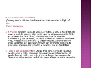 Este documento describe diferentes tipos de conectores tecnológicos y cómo se utilizan. Incluye conectores de video analógico como S-Video, video por componentes y VGA, así como conectores de audio y video analógico como video compuesto, SCART y coaxial RF. También describe diferentes tipos de operadores tecnológicos como mecánicos, eléctricos, neumáticos, hidráulicos y electrónicos.