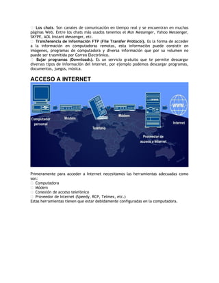 Internet se originó como una red de comunicación entre ordenadores llamada ARPAnet desarrollada por el gobierno de EE.UU. en la década de 1960, y ha crecido hasta convertirse en una red mundial que ofrece servicios como correo electrónico, videoconferencia, chats y descargas a más de 100 millones de usuarios en todo el mundo. Los usuarios pueden acceder a Internet a través de computadoras, módems, conexiones telefónicas y proveedores, y navegar entre páginas web utilizando navegadores.