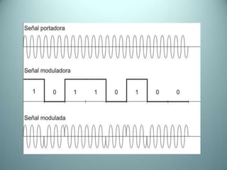 El documento resume diferentes tipos de modulación y multiplexación de señales, incluyendo: 1) Amplitud Modulada (AM), que varía la amplitud de la onda portadora; 2) Frecuencia Modulada (FM), que varía la frecuencia de la onda portadora; 3) Multiplexación por División de Frecuencias Ortogonales (OFDM), que transmite información a través de un conjunto de ondas portadoras de diferentes frecuencias; y 4) Multiplexación por División en el Tiempo (TDM), que asigna intervalos de tiempo f