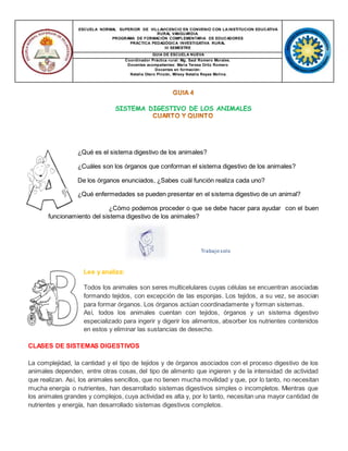 El documento describe los diferentes tipos de sistemas digestivos en animales. Explica que los sistemas digestivos pueden ser simples o completos, dependiendo de la complejidad del animal y sus necesidades energéticas. Describe los sistemas digestivos de varios grupos de invertebrados como poríferos, cnidarios, moluscos y artrópodos, así como de vertebrados como peces, anfibios, reptiles, aves y mamíferos. Explica las similitudes y diferencias en la estructura y función del sistema digestivo entre estos grupos.