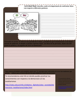 El documento describe las características y reglas de un debate. Un debate incluye grupos que defienden posiciones diferentes sobre un tema, con un moderador que controla el tiempo y da la palabra a cada grupo. Los participantes deben argumentar sus posturas de forma respetuosa sin atacar a los oponentes. El moderador resume al final las diferentes perspectivas.