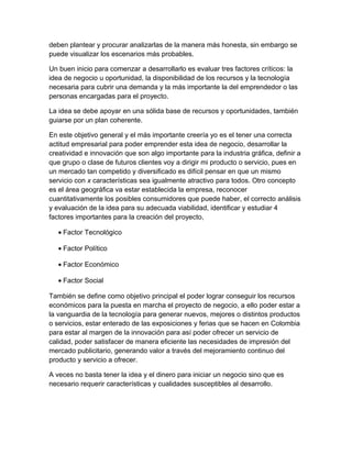 Este documento presenta un resumen del plan de negocios para RG Gráfica. Explica los objetivos de investigar el mercado, incluyendo identificar las necesidades de los clientes potenciales y el grupo objetivo. También analiza el sector de las artes gráficas en Colombia y la competencia. El documento justifica la idea del negocio para cubrir la demanda de servicios de comunicación gráfica para empresas pequeñas y medianas en Bogotá.