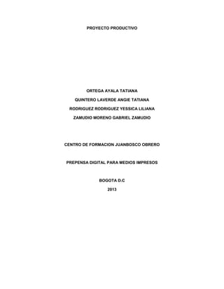 Este documento presenta un proyecto para crear catálogos holográficos innovadores utilizando efectos visuales. El proyecto es desarrollado por estudiantes para reformar la industria de la publicidad. Los catálogos mostrarían los productos desde el frente y la espalda de forma tridimensional. El proyecto analiza el mercado actual de catálogos, los competidores, y describe el proceso de diseño e impresión de los catálogos holográficos.