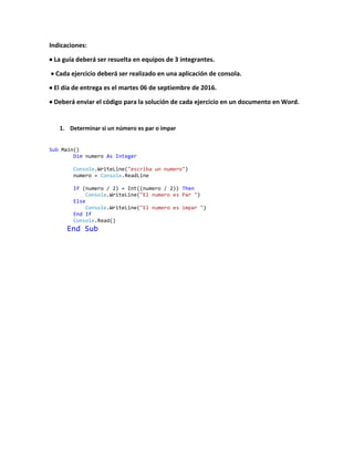 El documento presenta 11 ejercicios de programación en Visual Basic resueltos por un grupo de 3 estudiantes de la carrera de Ingeniería en Sistemas y Redes Informáticas. Los ejercicios incluyen determinar si un número es par o impar, resolver ecuaciones de segundo grado, calcular facturas con IVA y descuentos, y ordenar números de forma ascendente y descendente. El documento contiene el código de cada solución para su revisión.
