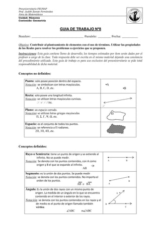 Este documento contiene una guía de trabajo sobre geometría para estudiantes de preuniversitario. Incluye definiciones de puntos, rectas, ángulos y otras figuras geométricas, así como notaciones matemáticas. Presenta ejercicios para identificar ángulos complementarios, opuestos y relaciones en figuras geométricas paralelas. El objetivo es practicar conceptos geométricos y resolver problemas usando las propiedades de los números reales.