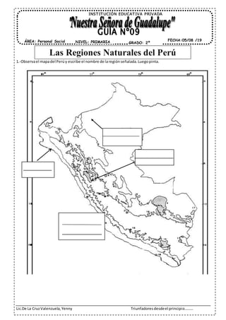 Este documento presenta preguntas sobre las cuatro regiones naturales del Perú: la Costa, la Sierra, la Selva y el Mar Peruano. Se pide identificar cada región en un mapa, nombrarlas, describir sus características principales como extensión, vegetación y relieve, y determinar en qué región vive el estudiante.