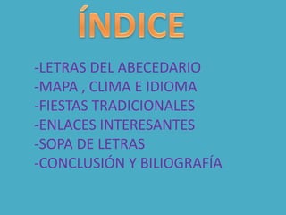 Este documento resume información sobre varios aspectos de Alemania, incluyendo lugares emblemáticos, comidas típicas, festivales y más. Describe brevemente el clima, idioma e importantes destinos turísticos de Alemania como Berlín, Múnich, Hamburgo y Frankfurt. También incluye enlaces útiles y una conclusión sobre los atractivos turísticos del país.
