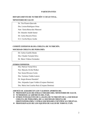 Este documento presenta las guías de alimentación para niños menores de 2 años en Chile. Fue desarrollado por un comité de expertos en nutrición del Ministerio de Salud chileno y la Sociedad Chilena de Pediatría. Incluye recomendaciones sobre lactancia materna, alimentación complementaria, suplementos nutricionales y consideraciones generales para diferentes etapas del desarrollo infantil. El objetivo es promover hábitos alimenticios saludables que prevengan enfermedades a lo largo de la vida.