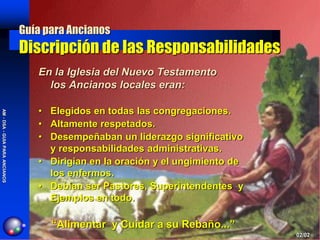 Los ancianos son llamados por Dios y elegidos por la congregación para liderar espiritualmente. Sus responsabilidades incluyen alimentar al rebaño, dirigir la adoración, administrar las actividades de la iglesia y ser ejemplos a seguir. La ordenación es un reconocimiento público de su liderazgo que les da autoridad para servir, aunque de forma limitada a la iglesia que los eligió.