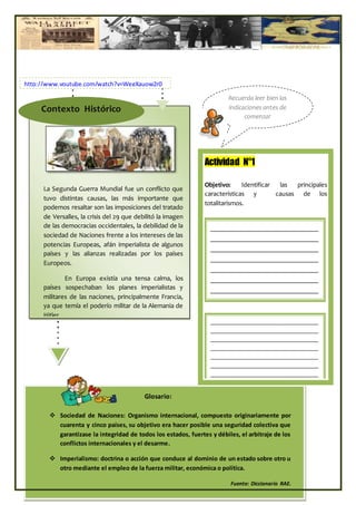 La lección trata sobre los antecedentes de la Segunda Guerra Mundial. Los objetivos son conocer los principales antecedentes que dieron inicio a la guerra y los países que participaron. Entre los antecedentes más importantes se mencionan las imposiciones del Tratado de Versalles, la crisis del 29 que debilitó las democracias occidentales, y el afán imperialista de algunos países. La lección incluye actividades de análisis de imágenes y un esquema resumen sobre los antecedentes.