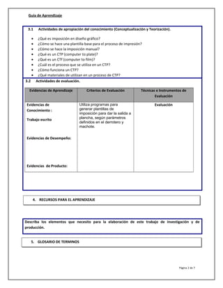 Este documento presenta una guía de aprendizaje sobre preprensa digital para medios impresos. Explica conceptos clave como la imposición, el proceso de CTP (del computador a la plancha) y CTf (del computador a la película). Describe las actividades de aprendizaje, los recursos y un glosario. El objetivo es enseñar a realizar la imposición digital de acuerdo con los parámetros de impresión y a procesar planchas de impresión usando tecnología CTP.