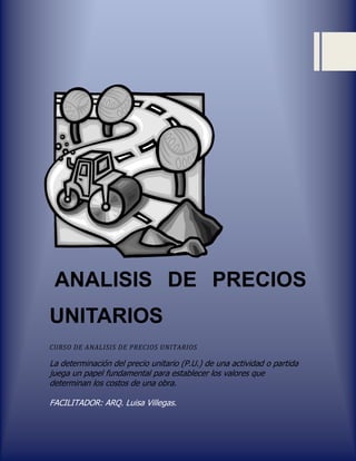 Este documento presenta los conceptos básicos para realizar el análisis de precios unitarios (APU) para una obra de construcción. Explica que el APU determina el precio unitario de cada actividad considerando los costos directos (materiales, equipos, mano de obra), costos indirectos (administración, gastos de oficina), utilidad e impuestos. Además, proporciona detalles sobre cómo calcular cada uno de estos componentes para establecer el costo total de la obra.