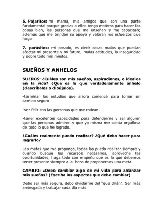 Este documento presenta la guía de un proyecto de vida de una persona. Describe sus raíces familiares, sus valores fundamentales como el respeto y la amistad, y sus sueños de terminar sus estudios, tener éxito en su carrera y ser feliz con sus seres queridos. Incluye metas a corto, mediano y largo plazo para lograr estos objetivos, así como los recursos, obstáculos y acciones necesarias para alcanzar su visión del futuro.