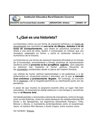 El documento define la historieta como una forma de expresión artística que consiste en una serie de dibujos que componen un relato. Explica que las historietas se componen de viñetas que contienen ilustraciones y pueden incluir globos de texto y otros símbolos. También describe los pasos básicos para crear una historieta, que incluyen conceptualizar la historia, crear las ilustraciones y viñetas, y revisar los detalles finales.