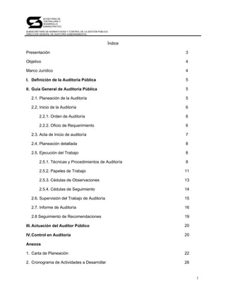 Este documento presenta la Guía General de Auditoría Pública actualizada. Incluye la definición de auditoría pública, los pasos del proceso de auditoría como la planeación, inicio, ejecución, supervisión, informe y seguimiento. También cubre aspectos como la actuación del auditor público y el control de la auditoría. Finalmente, incluye anexos con modelos de documentos como la orden de auditoría, acta de inicio, papeles de trabajo y formatos de informes. El objetivo es estandarizar el trabajo de auditoría en las dependencias públic