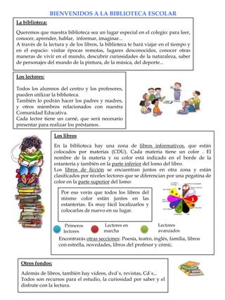 La guía presenta la biblioteca escolar "Gabriel y Galán" para estudiantes, maestros y padres. Explica que la biblioteca contiene libros clasificados por tema y nivel de lectura, así como otros recursos como videos y revistas. Detalla los horarios de apertura, préstamos de libros y normas de conducta para cuidar los materiales y mantener un ambiente de aprendizaje.