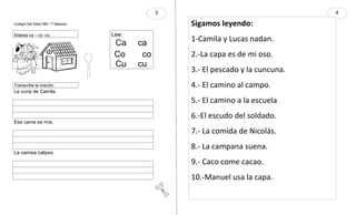 Este documento contiene instrucciones para un ejercicio de lectura y escritura de sílabas (ca, co, cu) para estudiantes de primer grado. Incluye una lista de 10 oraciones para leer y practicar la transcripción de una oración específica que contiene esas sílabas.