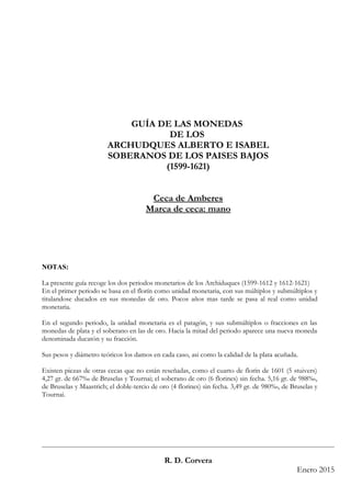 Este documento proporciona una guía de las monedas acuñadas durante los reinados de los Archiduques Alberto e Isabel como soberanos de los Países Bajos entre 1599 y 1621. Describe las diferentes monedas de plata, cobre y oro acuñadas en Amberes durante este periodo, incluyendo sus denominaciones, pesos, leyes y cantidades producidas. La guía también resume los dos periodos monetarios distintos que ocurrieron durante el reinado, cambiando la unidad monetaria de florín a real y luego a pat