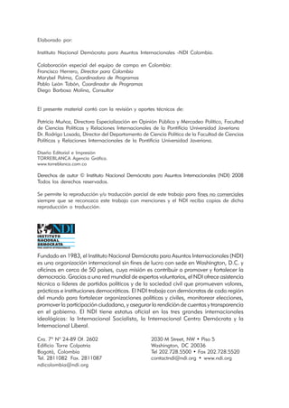 Este documento presenta una guía práctica sobre el régimen de bancadas en Colombia. Explica los avances de la reforma política colombiana, los beneficios de la actuación en bancadas, cómo funciona el régimen de bancadas en Colombia, las sanciones por incumplimiento, el control político, y los retos para mejorar el régimen de bancadas. El objetivo es facilitar la comprensión de este tema para fortalecer la democracia colombiana.