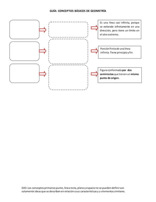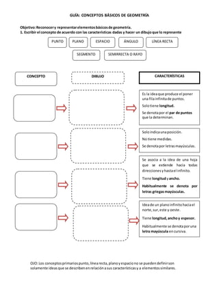 El documento presenta los conceptos básicos de geometría como punto, línea recta, plano y espacio. Define cada concepto mediante sus características y proporciona dibujos para representarlos, incluyendo puntos, líneas rectas, segmentos, semirrectas, rayos, ángulos y planos. El objetivo es reconocer y representar estos elementos geométricos fundamentales.