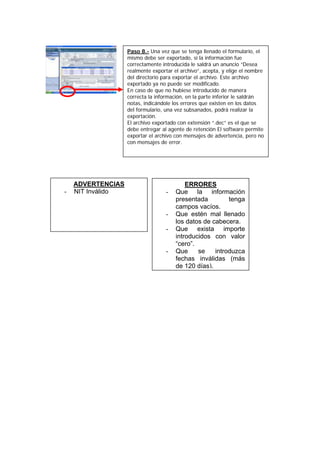 El documento describe 8 pasos para completar y exportar el Formulario F87 RC-IVA usando el software DaVinci: 1) Ejecutar DaVinci, 2) Iniciar sesión, 3) Seleccionar "Formularios Electrónicos", 4) Seleccionar "F87 RC-IVA", 5) Completar los datos de cabecera, 6) Completar los datos de facturas y fecha de presentación, 7) Guardar el formulario, 8) Exportar el archivo una vez completado o corregir errores y luego exportar.