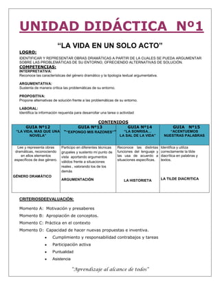 Este documento presenta una guía didáctica para la enseñanza del género dramático. Incluye definiciones de teatro, sus elementos básicos y técnicos, y diferentes géneros teatrales. Propone actividades como la lectura y representación de obras dramáticas, el desarrollo de un guión teatral a partir de un cuento, y la consulta sobre la obra de Oscar Wilde "El gigante egoísta". El objetivo es que los estudiantes aprendan sobre este género y puedan argumentar sobre problemáticas de su