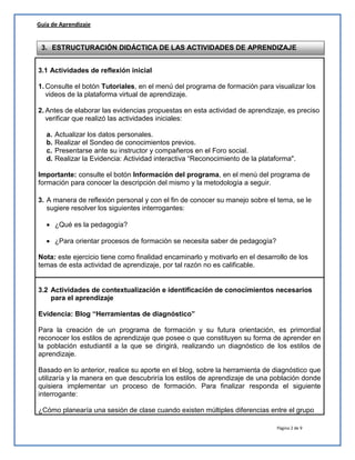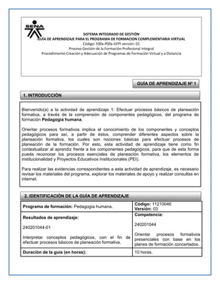 Este documento presenta una guía de aprendizaje para un programa de formación en pedagogía humana. La guía contiene actividades para que los aprendices comprendan conceptos pedagógicos y procesos de planeación formativa a través de evidencias como blogs, evaluaciones y la inducción a un plan de formación. El objetivo es que los aprendices sean capaces de orientar procesos formativos presenciales basados en planes de formación.