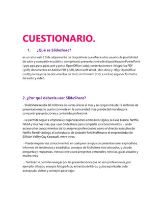 SlideShare es un sitio web que permite a los usuarios subir y compartir presentaciones en diferentes formatos como PowerPoint, PDF y Word. Recibe millones de visitas al mes debido a su gran comunidad de usuarios profesionales que comparten conocimiento. Los usuarios pueden mejorar sus conocimientos en cualquier tema al acceder a presentaciones explicativas subidas por expertos de empresas como Netflix y NASA. El análisis de datos en SlideShare se refiere al estudio de hechos y cifras para obtener información válida, mientras que el rebranding implica cambios en