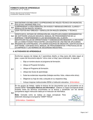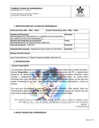 Este documento presenta una guía de aprendizaje para el mantenimiento preventivo y correctivo de equipos de computo. La guía incluye 7 resultados de aprendizaje relacionados con hardware, software y redes. También describe 9 actividades de aprendizaje como crear un blog, elaborar mapas conceptuales, usar herramientas de software y hardware, e identificar componentes de computadoras. El objetivo es que los aprendices adquieran conocimientos sobre mantenimiento de equipos de computo.